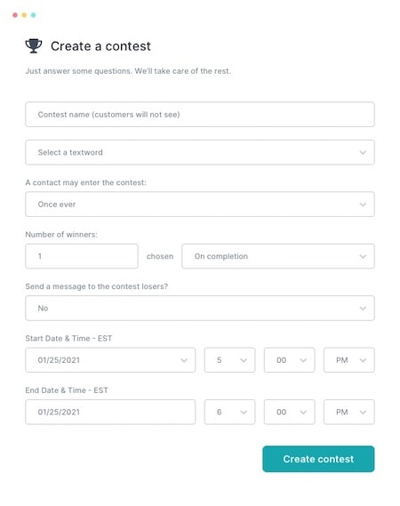 The best part is that the entire processes runs on its own once set up. Whether you're looking to run a one time text to win sweepstakes or want to kick off a new SMS marketing program with a contest, our service is the perfect solution for you. Don't hesitate to reach out to our team with any questions you may have.